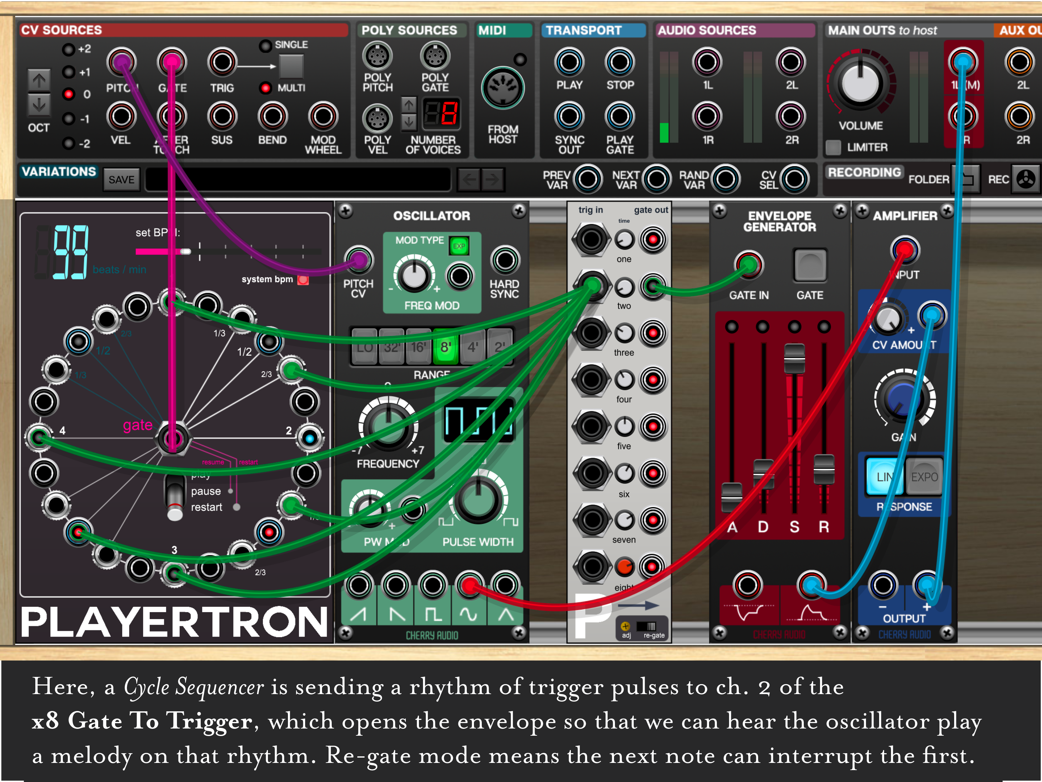 With eight independent parallel converters that automatically engage when plugged in, you can fit a lot of conversion into a small space and still see what you’re trying to patch together within a narrow screen. Consider using it to create timing variations, as a switchboard for interesting activities, and for making the Cycle Sequencer cooperate with envelope generators.